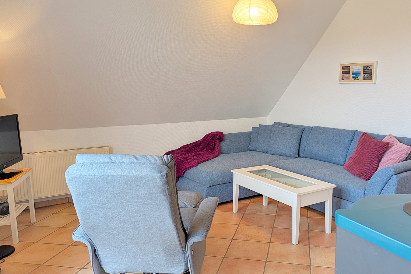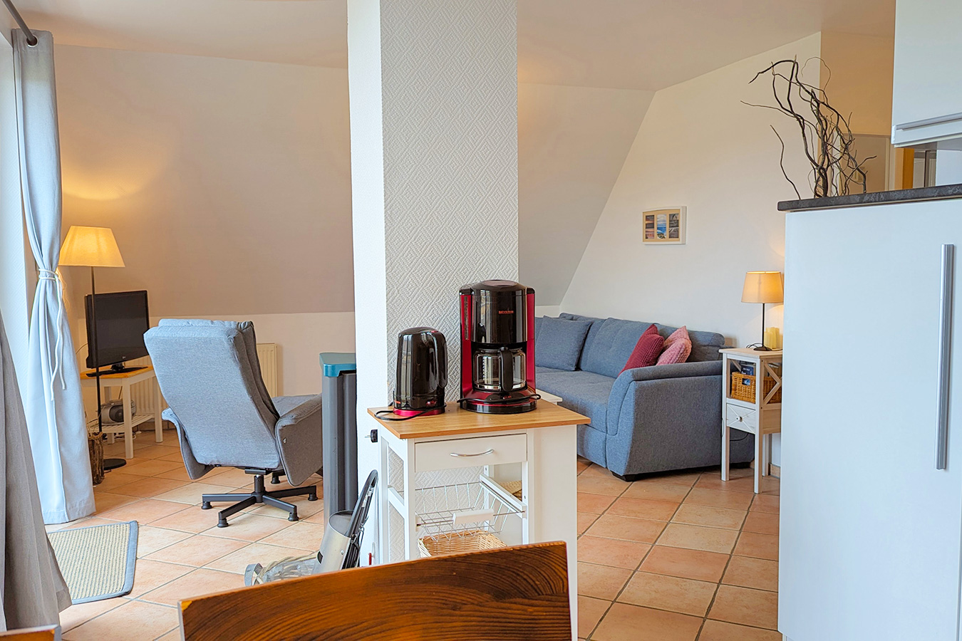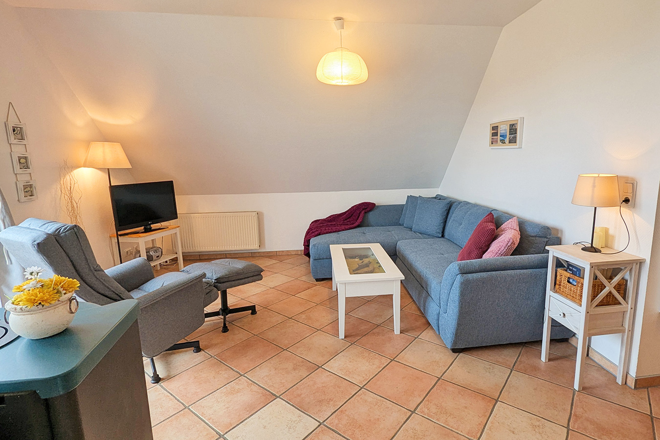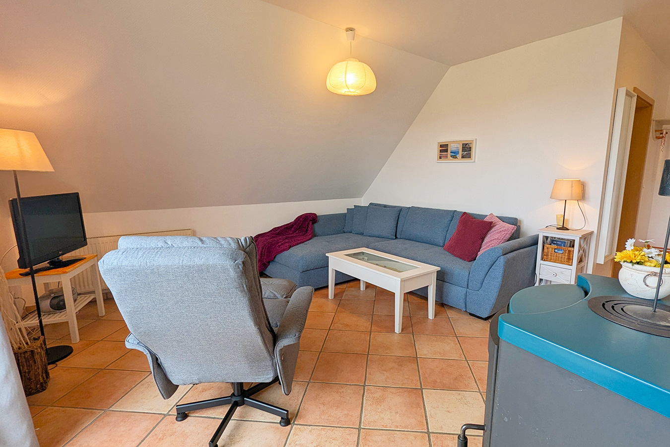 Die Wohnung Donnerkeil befindet sich im 1. Obergeschoss des Hauses Min Droom (Mein Traum). Im Haus befinden sich insgesamt 4 Wohnungen. Eine davon steht nicht zur Vermietung an Feriengäste zur Verfügung.