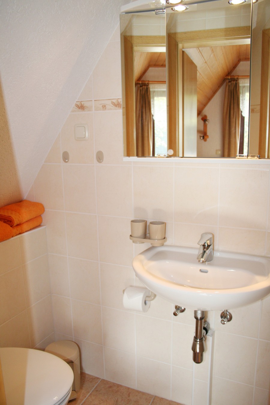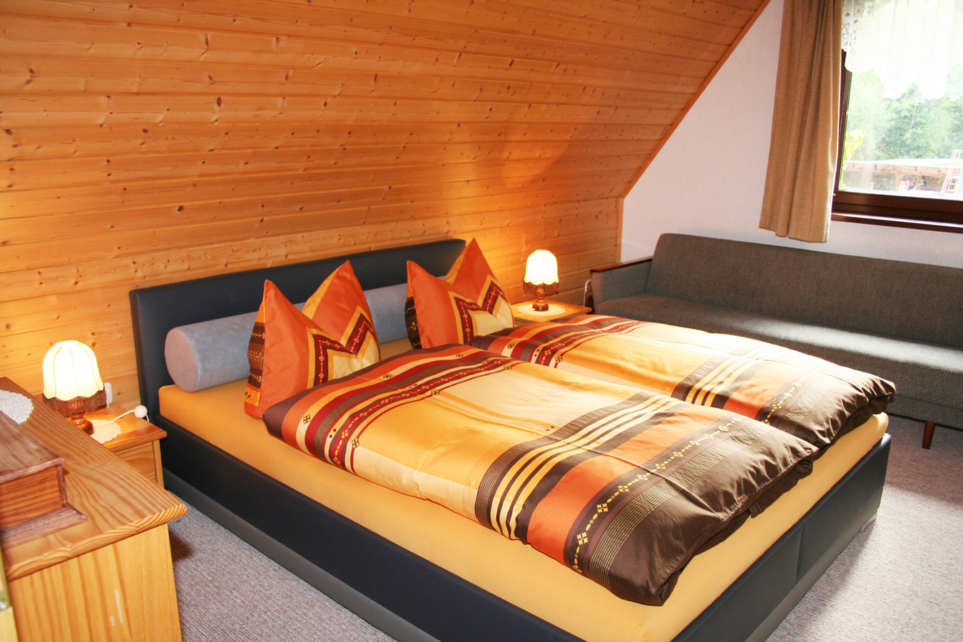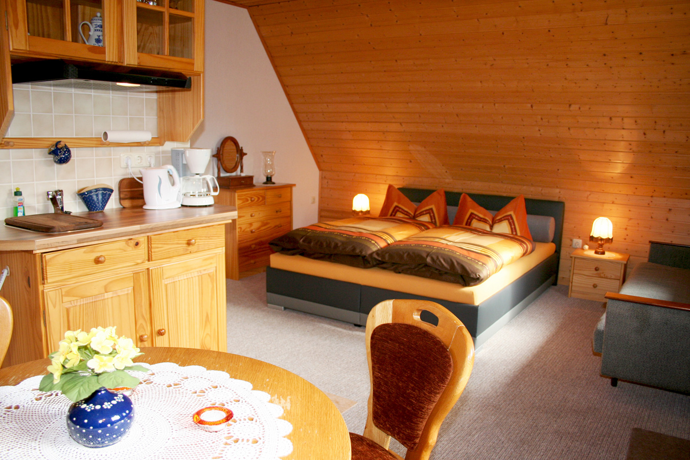 Das Doppelzimmer ist separat über eine Außentreppe mit Balkon zu erreichen und befindet sich in der ersten Etage des Hauses. Hier erwartet Sie ein Wohn-Schlafraum mit einem Doppelbett (180x200) und einer Sitzecke mit Esstisch. Ihnen stehen weiterhin ein Mini-Kühlschrank, Kaffeemaschine, Wasserkocher und eine Mikrowelle zur Verfügung. Eine Kochgelegenheit (einflammig) ist vorhanden. Ein kleines Bad mit Dusche/WC und ein Sat-TV-Gerät gehören selbstverständlich auch zur Ausstattung.