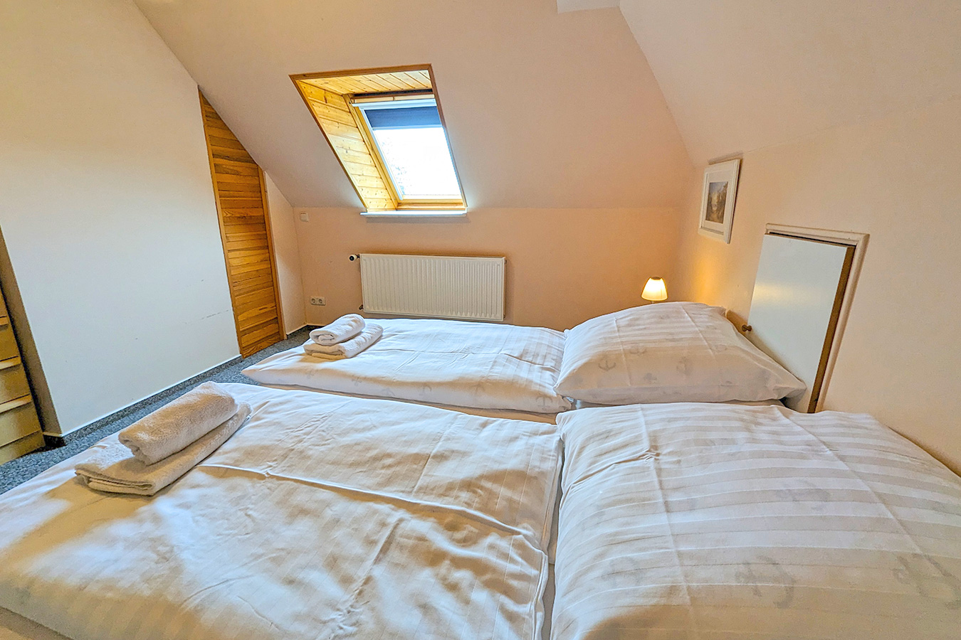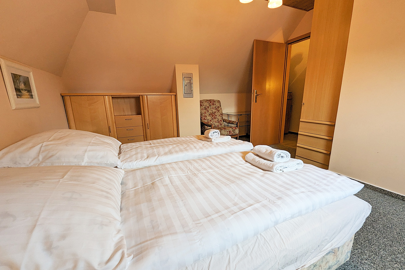 Das dritte Schlafzimmer mit zwei Einzelbetten ist im Dachgeschoss zu finden.