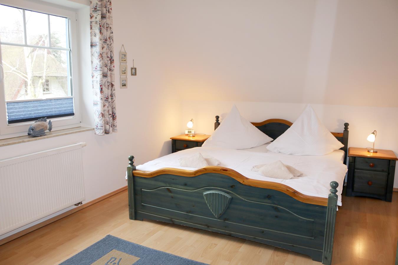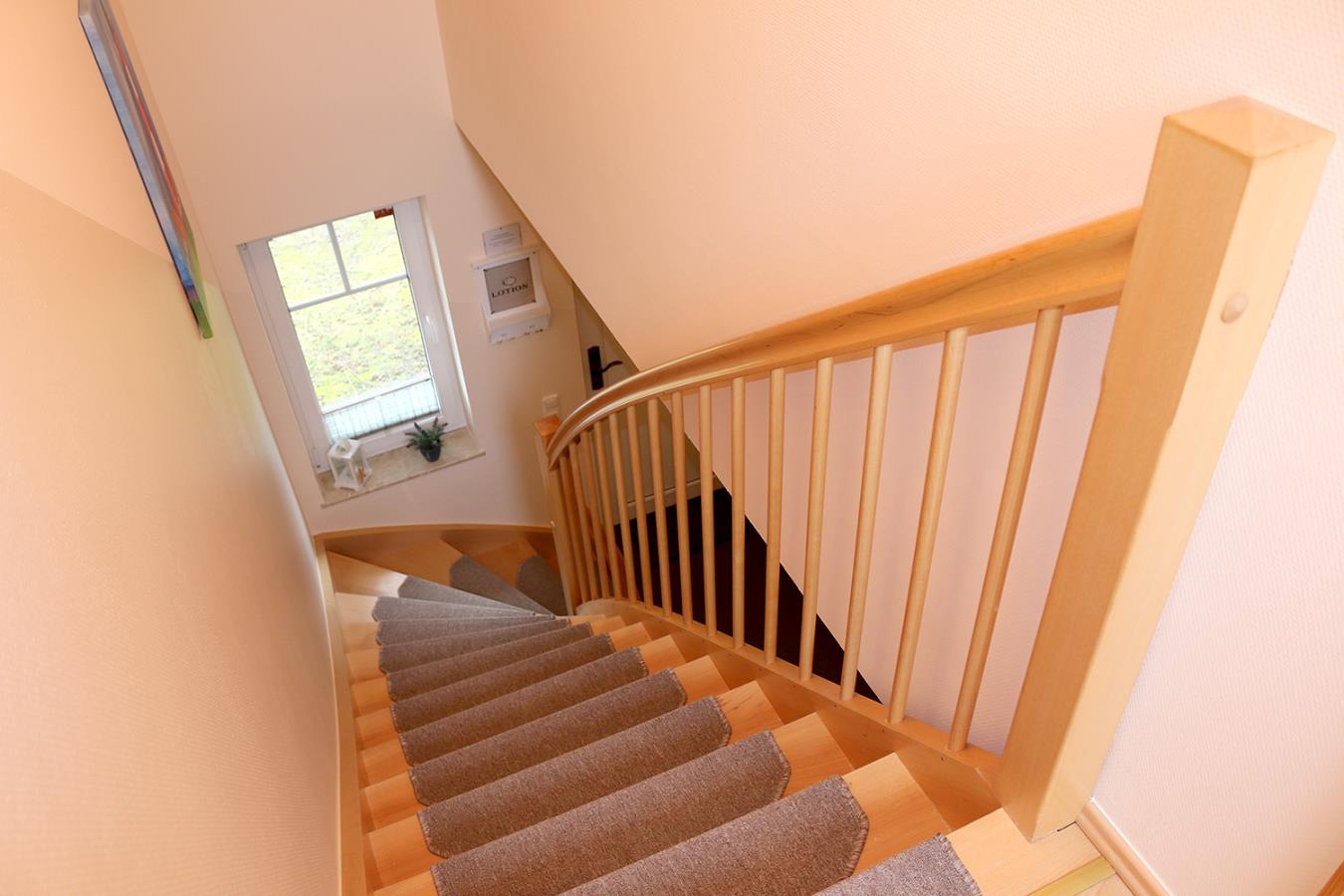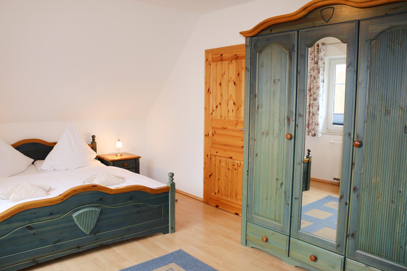 Über eine Holztreppe gelangt man vom Flur ins Obergeschoss mit den beiden Schlafzimmern. Beide sind mit Doppelbetten und Kleiderschränken ausgestattet.