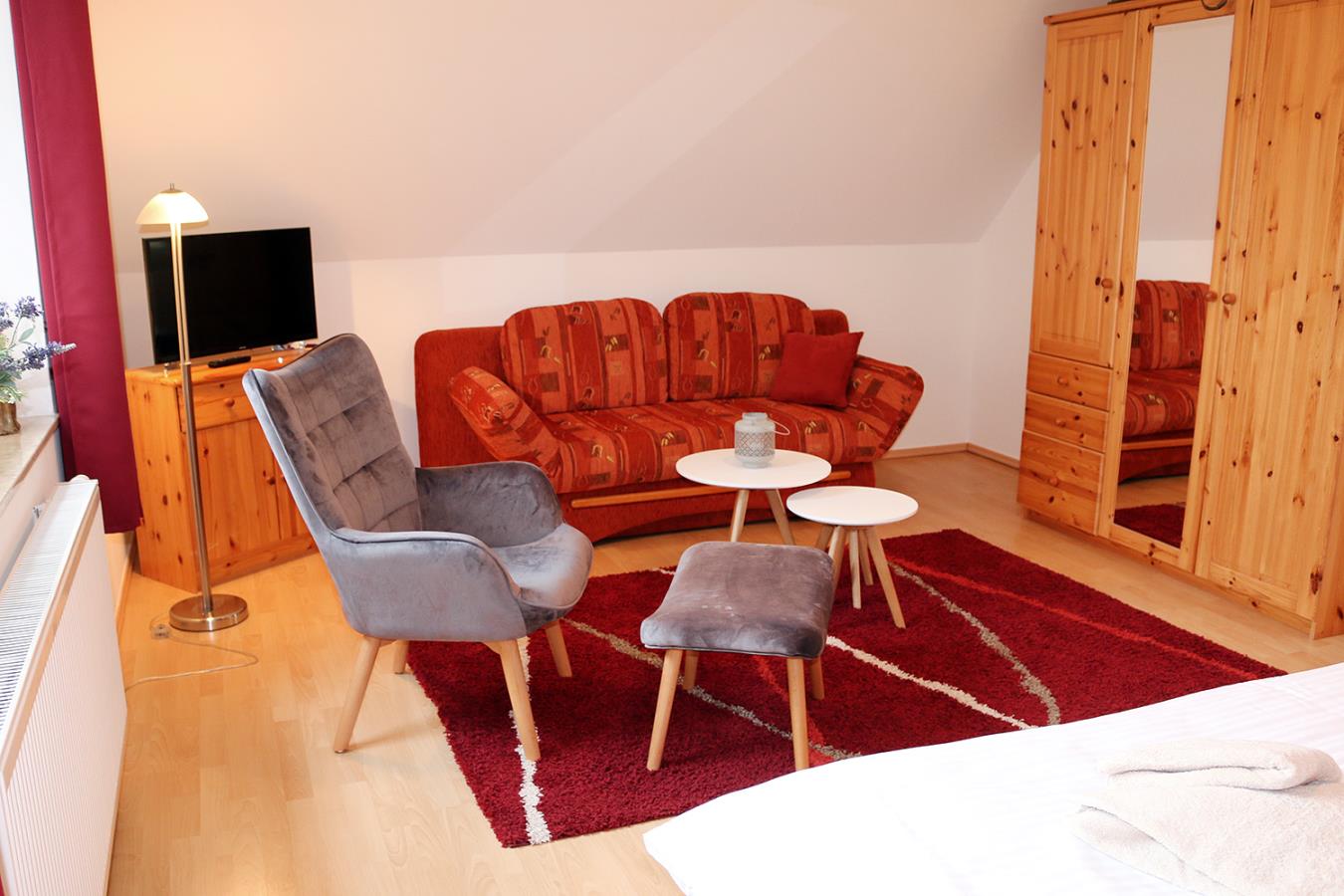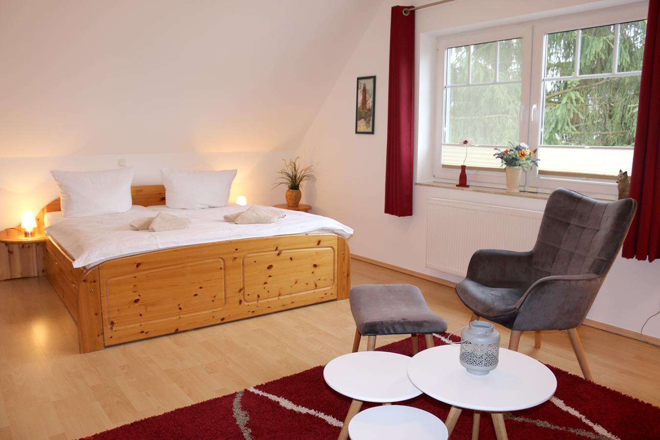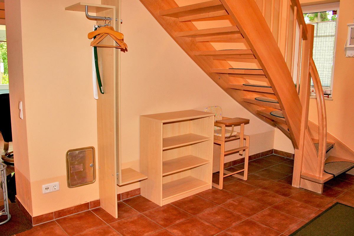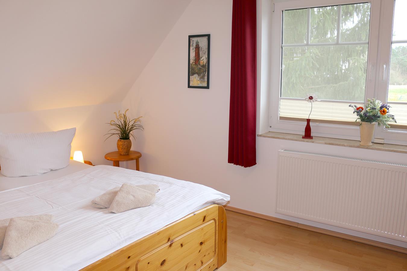 Über eine Holztreppe gelangt man vom Flur ins Obergeschoss mit den beiden Schlafzimmern. Beide sind mit Doppelbetten und Kleiderschränken ausgestattet.