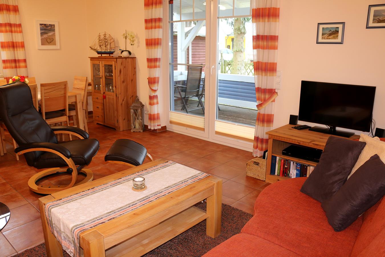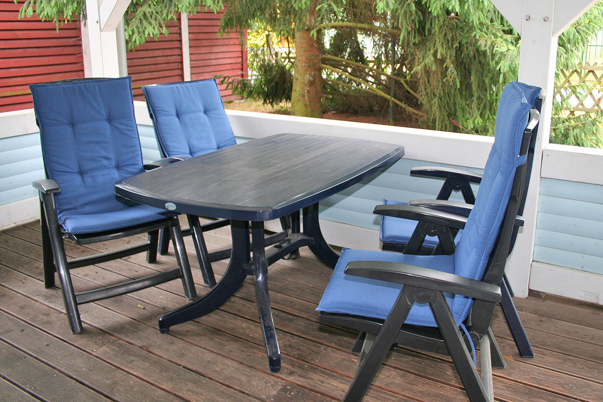 Die Holzterrasse ist möbliert und auch direkt vom Wohnzimmer aus begehbar.