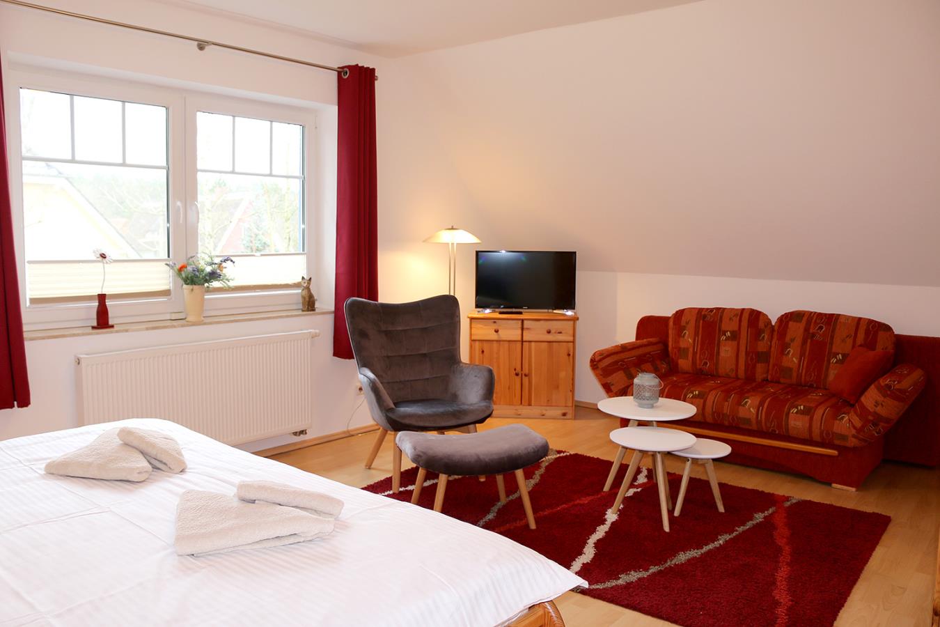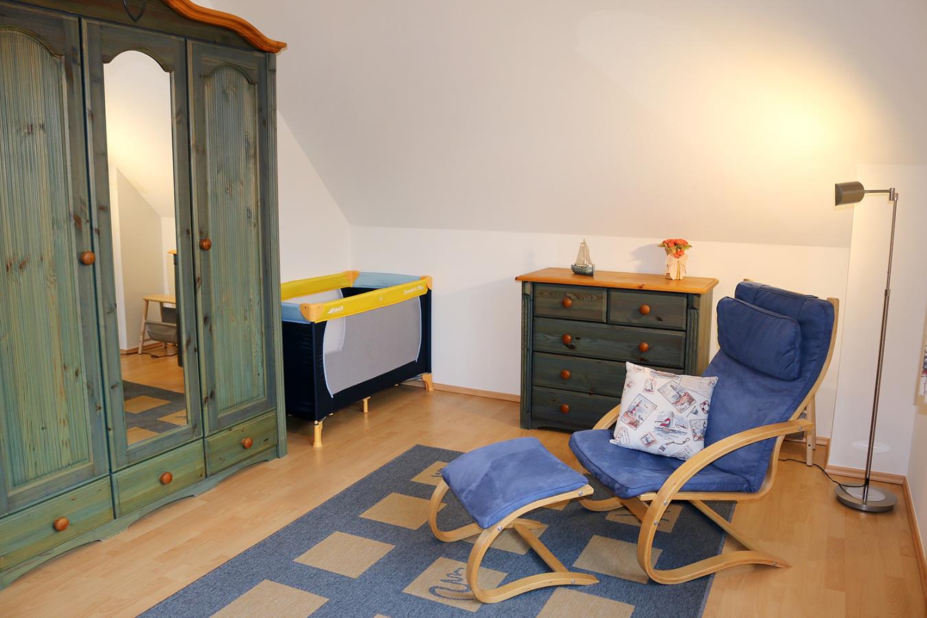 In einem der Schlafzimmer steht zusätzlich noch ein Kinderreisebett für ein mitreisendes Kleinkind. Im anderen gibt es einen TV und eine Couch.