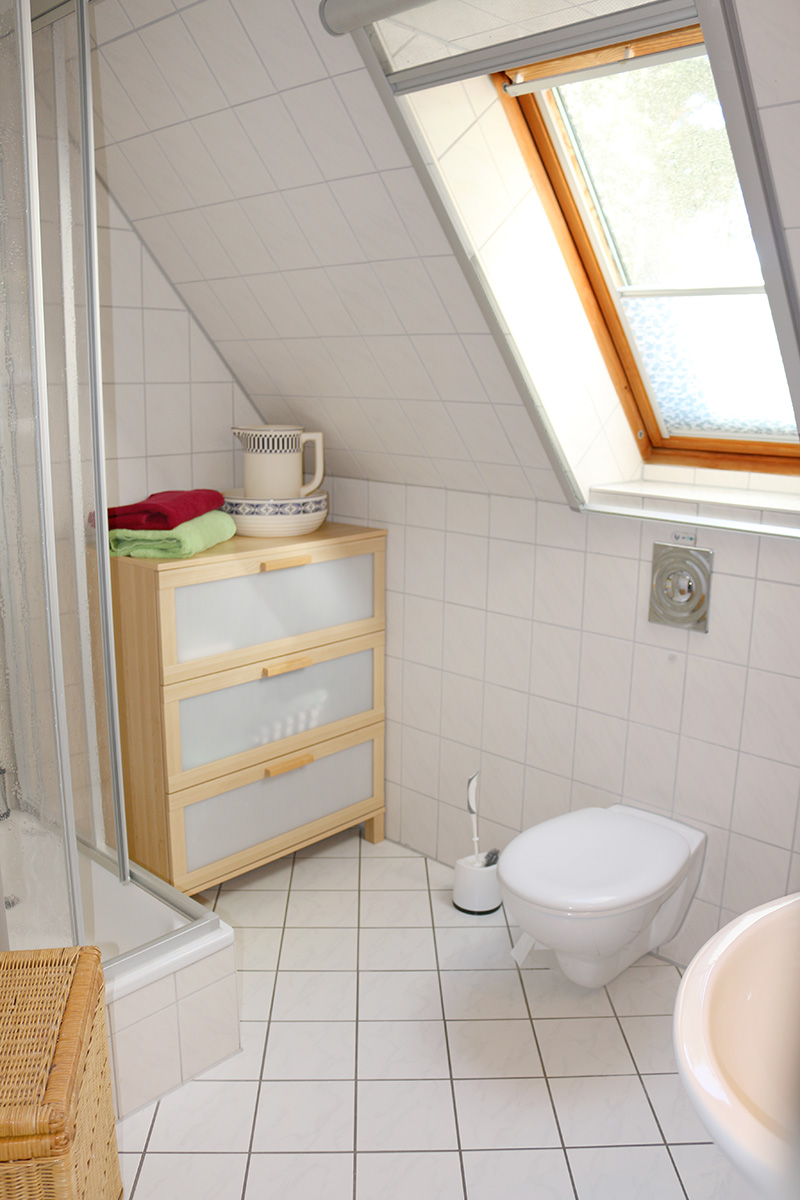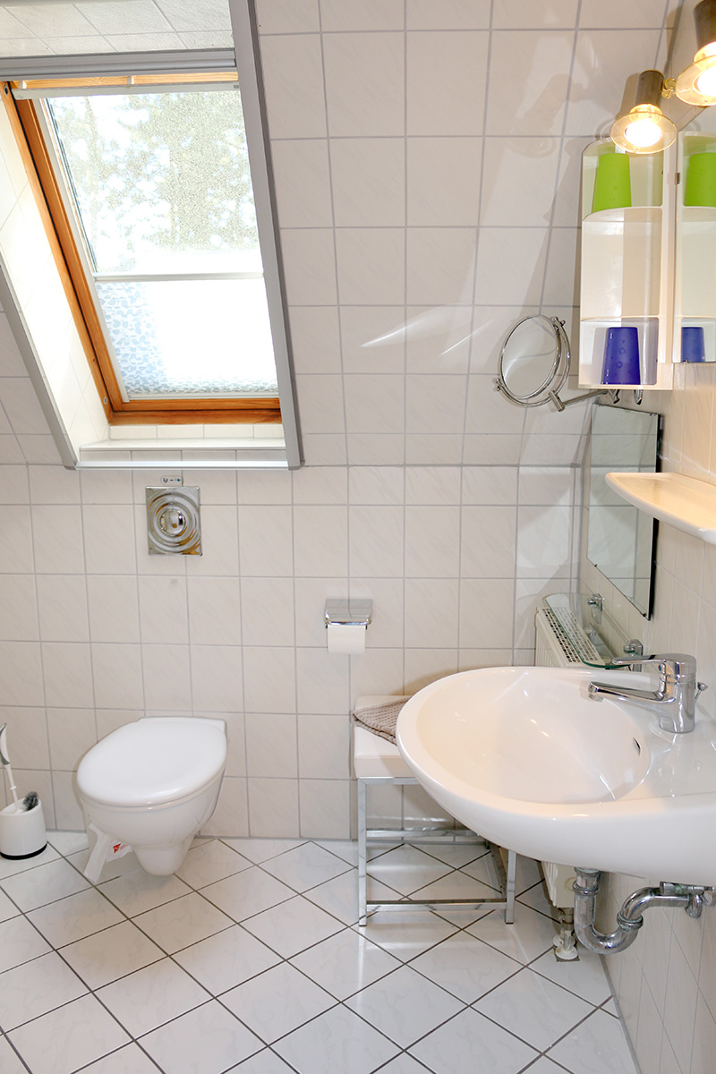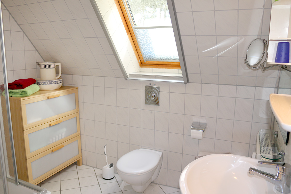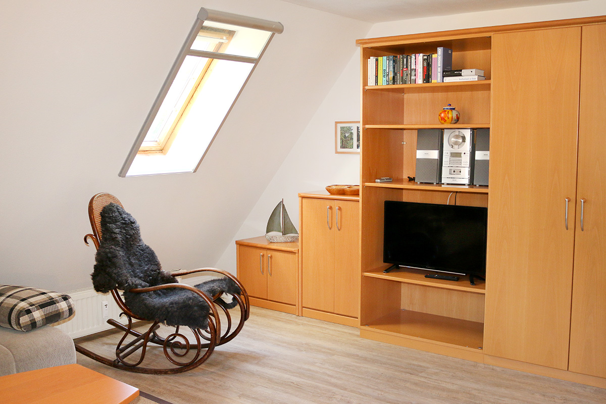Eine Treppe führt vom Wohnzimmer aus ins Dachgeschoss der Wohnung. Hier finden Sie einen Wohn-Schlafbereich mit zwei Doppelschlaf-Couchen, zwei Sesseln und Fernseher. Ein weiteres Bad mit Dusche und WC macht das Dachgeschoss zu einer fast unabhängigen Wohneinheit.