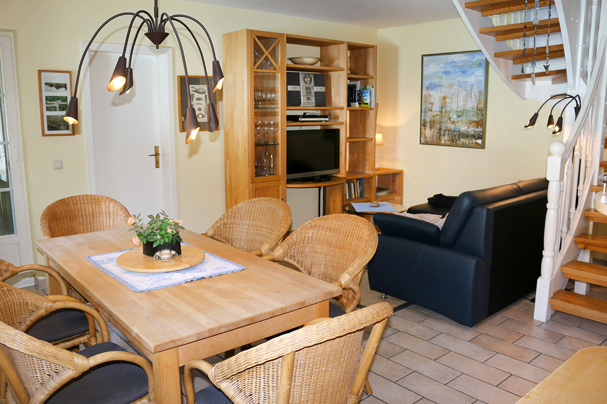 Auf 2 Ebenen bietet die Wohnung insgesamt 80 m² Wohnfläche. Im Obergeschoss finden Sie das gemütliche Wohnzimmer mit SAT-TV, Radio und Couch, sowie die große und eine sehr gut ausgestattete Küchenecke mit Herd, Backofen, Geschirrspüler. In einer kleinen Abstellkammer befindet sich ein zweiter Kühlschrank und eine Mikrowelle. Ebenfalls auf dieser Etage befindet sich ein Schlafzimmer mit Doppelbett und Schrank. Vom Wohnzimmer aus gelangen Sie auf den Balkon (Morgensonne). Im großen Bad gibt es Dusche, WC und eine Waschmaschine.