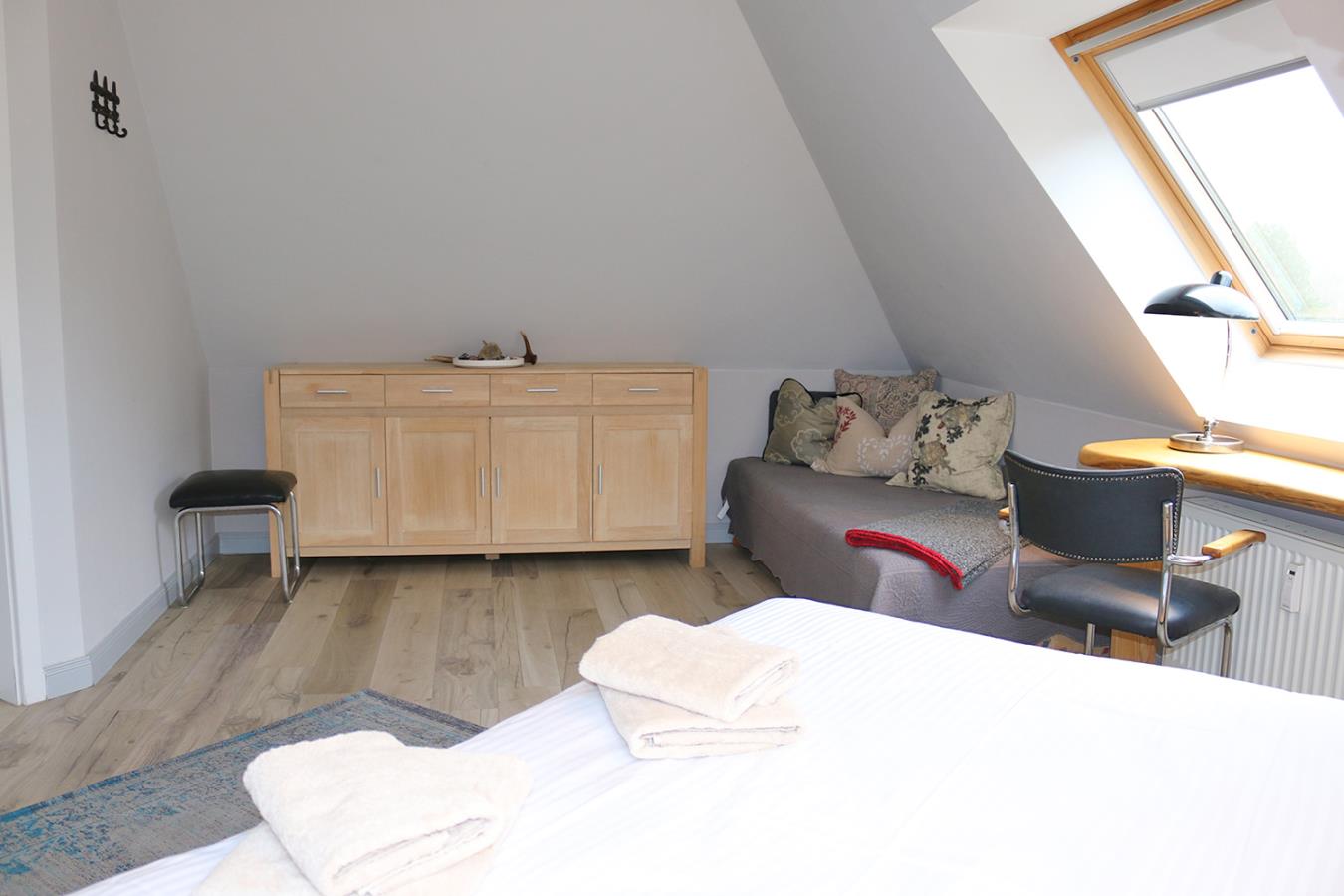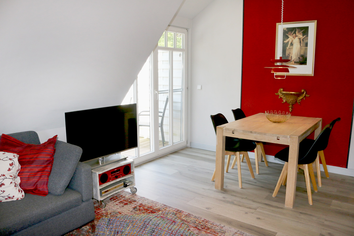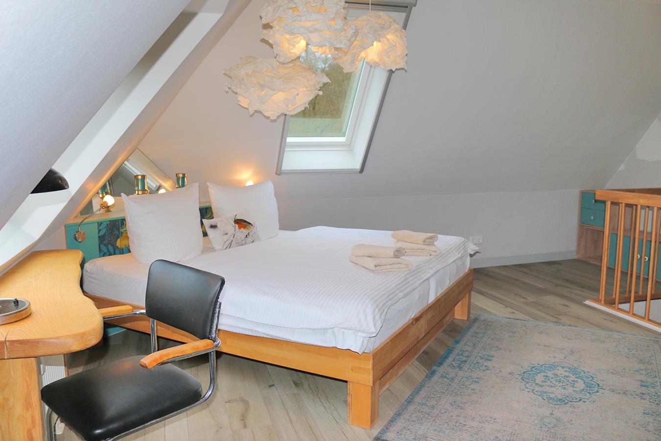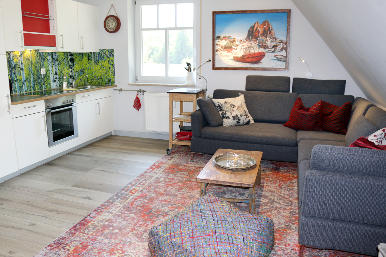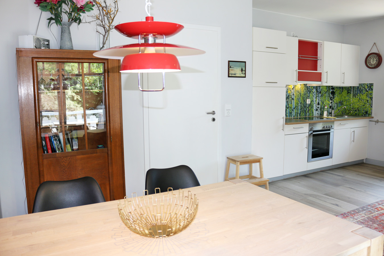 Die voll ausgestattete Küchenzeile (mit Geschirrspüler) ist ebenfalls in den Wohnbereich integriert. In 2 Schlafzimmern (eins in jeder Etage) steht Ihnen jeweils 1 Doppelbett zur Verfügung. In einem der Schlafzimmer befindet sich zusätzlich noch ein Einzelbett. Das zweite Schlafzimmer ist über eine offene Treppe im Dachgeschoss erreichbar. Platz für Ihre Kleidung finden Sie in den geräumigen Kommoden der Schlafzimmer.