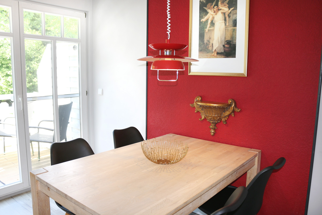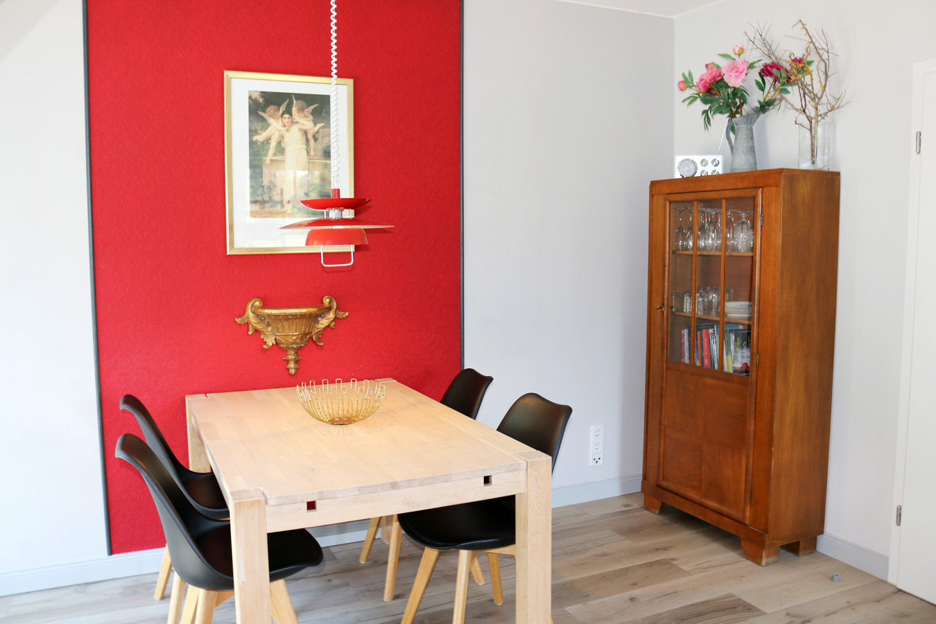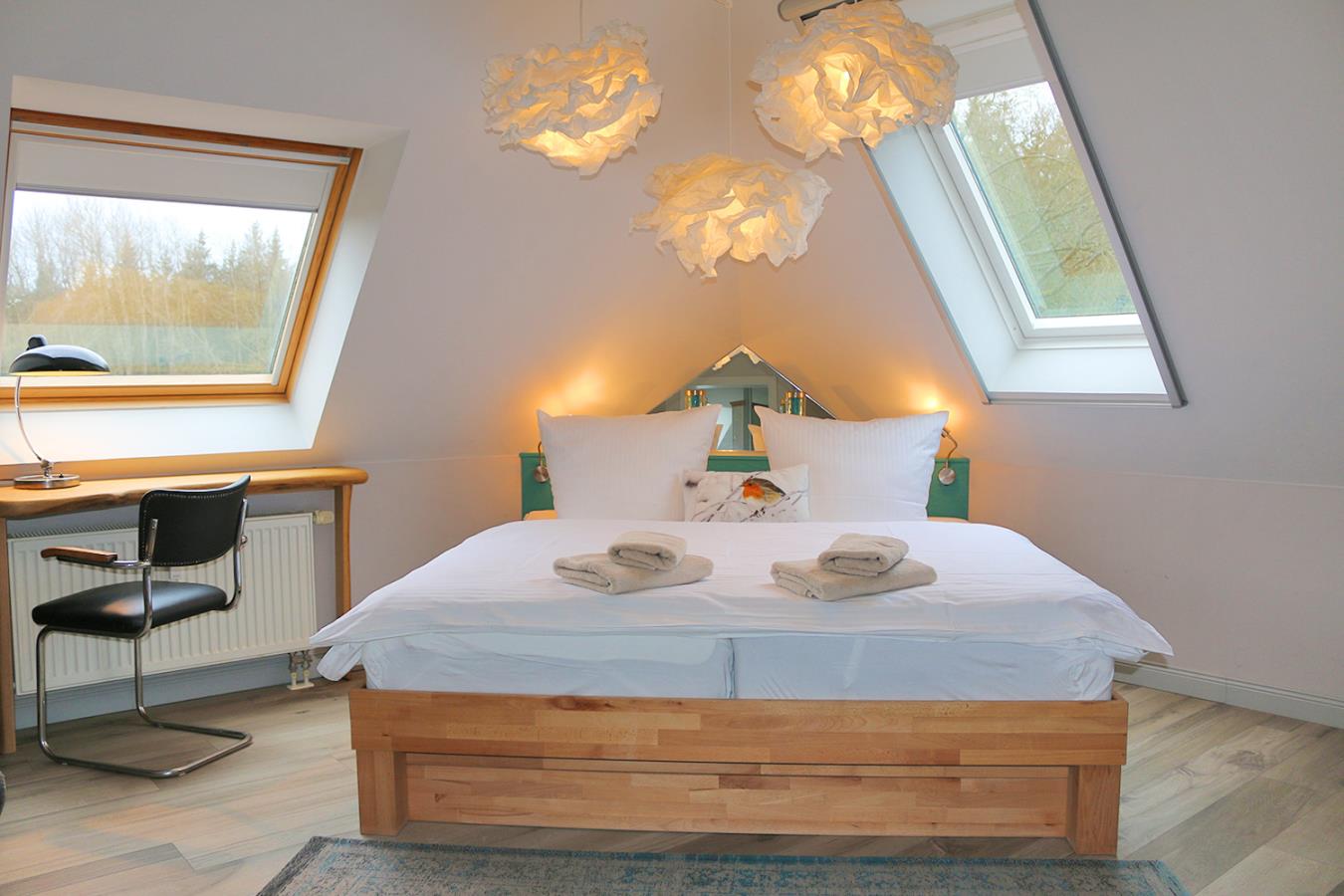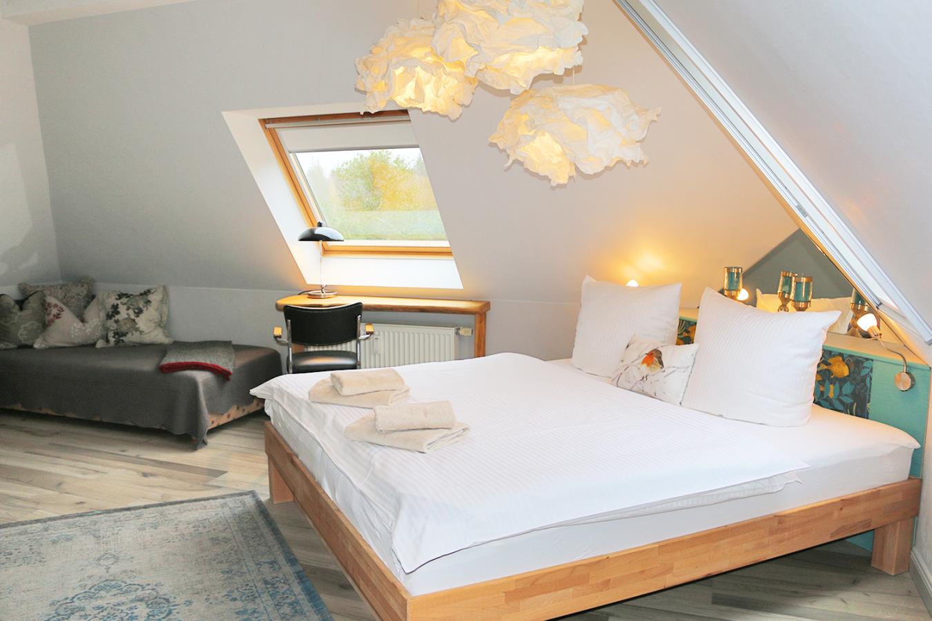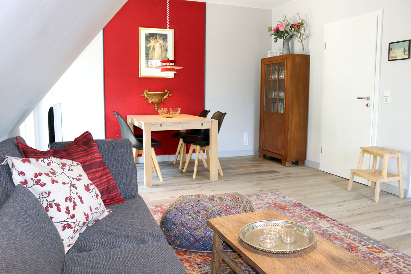 Die voll ausgestattete Küchenzeile (mit Geschirrspüler) ist ebenfalls in den Wohnbereich integriert. In 2 Schlafzimmern (eins in jeder Etage) steht Ihnen jeweils 1 Doppelbett zur Verfügung. In einem der Schlafzimmer befindet sich zusätzlich noch ein Einzelbett. Das zweite Schlafzimmer ist über eine offene Treppe im Dachgeschoss erreichbar. Platz für Ihre Kleidung finden Sie in den geräumigen Kommoden der Schlafzimmer.