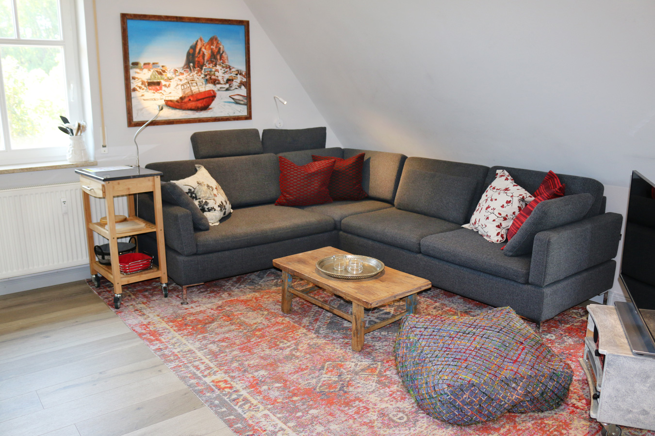 Im Wohnzimmer (1. Etage) finden Sie eine gemütliche Couch, Sat-TV, DVD-Player und CD-Radio.